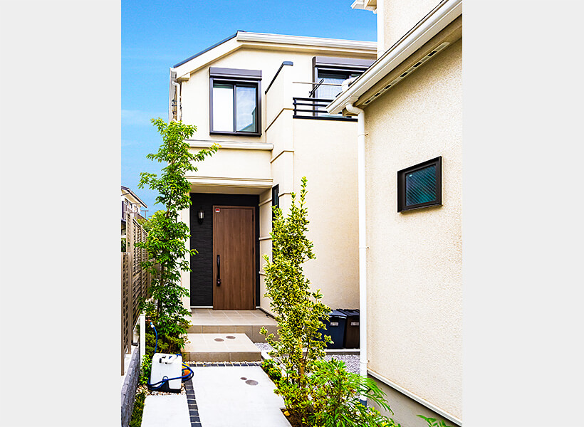 玄関までのアプローチには、お車とご家族分4台の自転車を置いていらっしゃいます。「敷地延長区画で車2台分を停められるスペースがあるので、4台分の自転車も余裕をもって置くことができます」と奥さま。