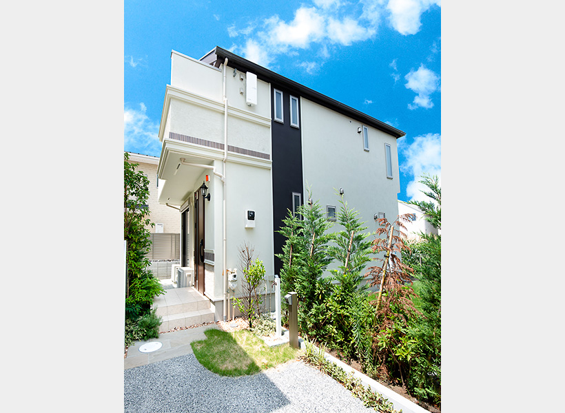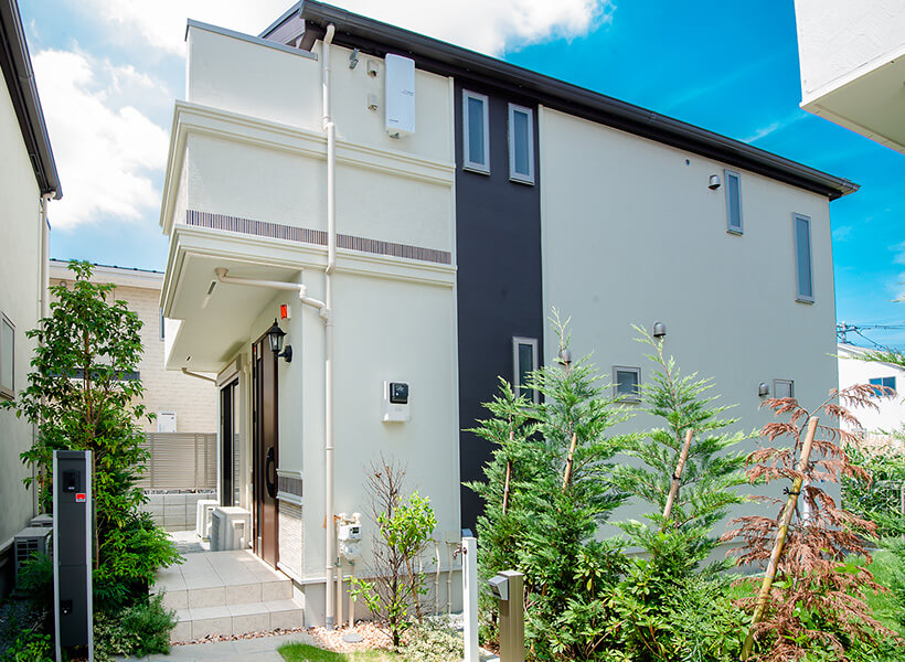 白を基調とした外壁に、アクセントタイルで個性をプラスしたモダンな外観に、街区内に施された植栽が安らぐ景観を演出しています。「庭先のローズマリーをお料理に使ってみようと思います」と奥さま。