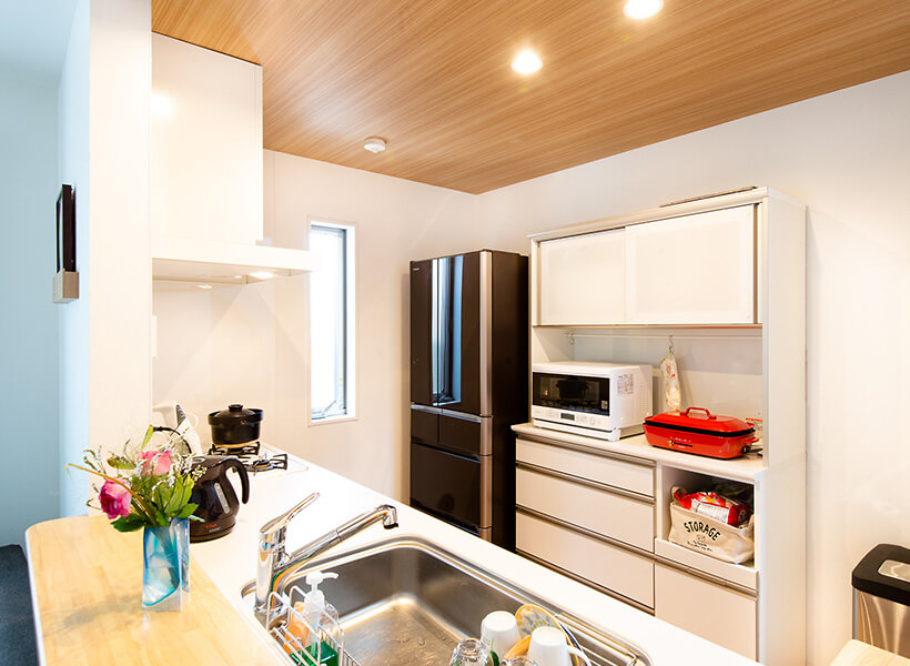 雑然としがちなキッチンや洗面スペースもとてもキレイにすっきりと暮らされているH様。「実際に住んでみて感じるのは収納の充実ぶり。キッチンや洗面所には床下収納があり、洗剤や食材のストックを入れています。2階の12.7畳の部屋には、奥行きのあるメーンクローゼットのほかにもうひとつクローゼットがあり、さらに5.1畳ほどの小屋裏収納も。造りつけの収納で充分間に合うので、家具はほぼ買い足す必要もなく、片付いた状態で暮らせています」と奥さま。