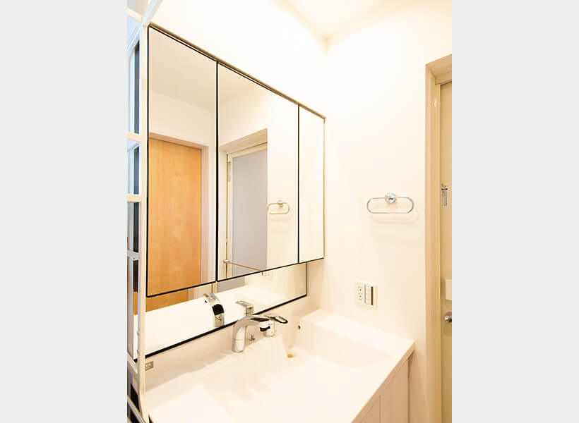 「脚を伸ばせる大きなバスタブに入ると、一戸建てで良かったなぁと思います。シャワーヘッドもスタイリッシュで気に入っています」とご主人。奥さまは、「洗面の三面鏡が思いのほか便利で、横顔や後ろ姿をチェックするのに役立っています」。