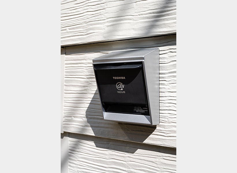 玄関横には、EV充電用屋外コンセントを設置しています。