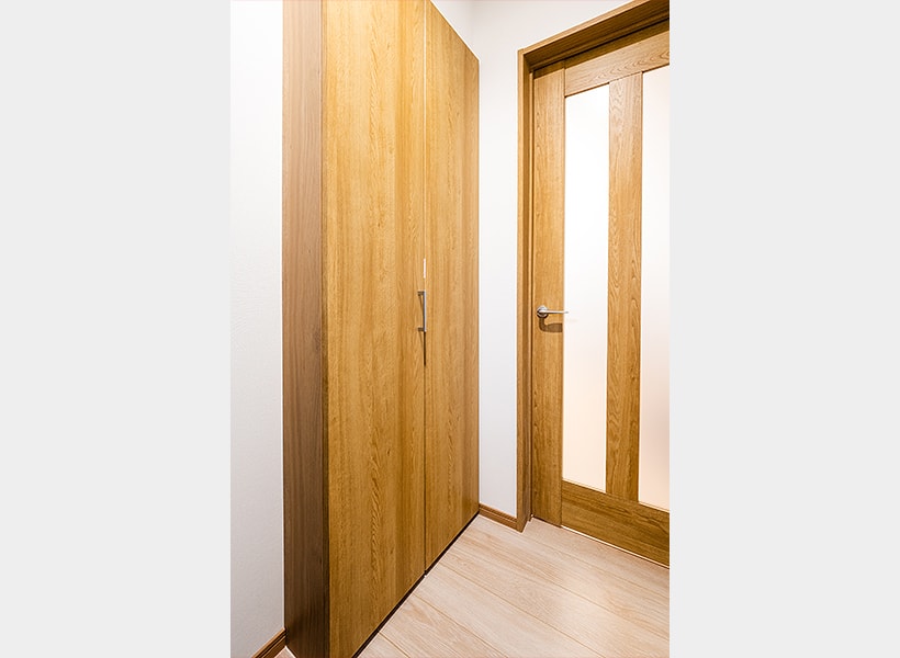 以前は玄関を入って左手に階段の上り口がありました。今回、リビングイン階段に変更したため、かつて階段上り口があった場所には玄関用収納ボックスを設置しました。