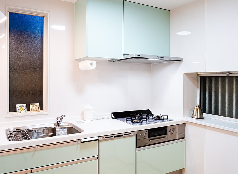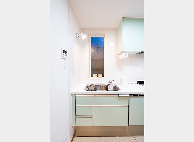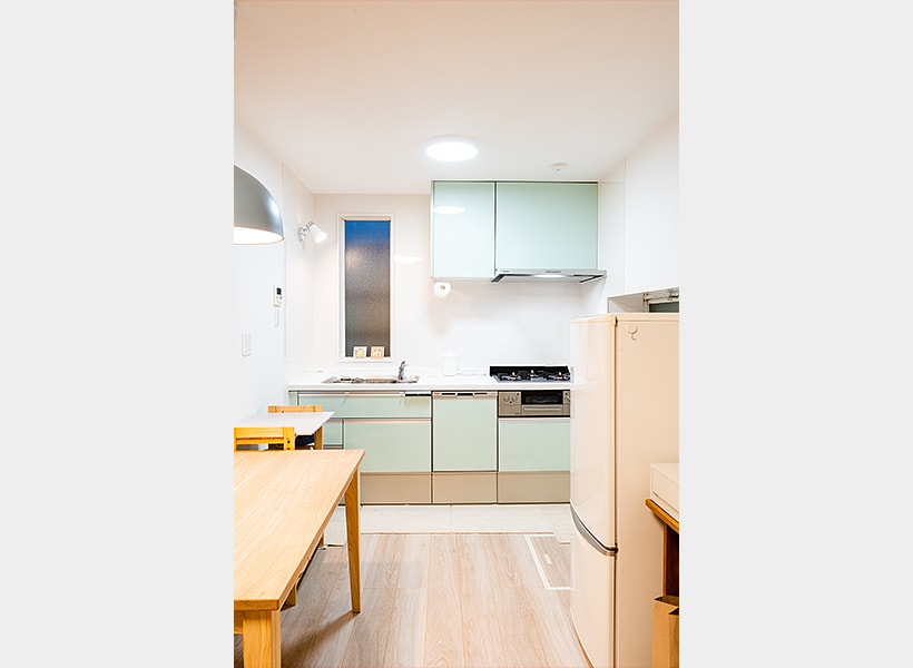 L型だったキッチンは、I型に変更しました。奥さまが「最初は白にしようと思っていましたが、殺風景になりそうだったのでさわやかなこの色を選びました」とおっしゃる淡いペパーミントグリーンの扉が、LDKのアクセントになっています。「以前はキッチン部分の床がLDより一段下がっていてホコリがたまりやすく、掃除もしづらかったのですが、段差をなくしたことで掃除も移動も、とても楽になりました」と奥さま。