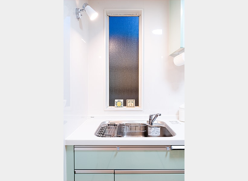 以前、ここにはコーナー出窓がありました。「強度的にも不安でしたし、お隣とも近く、窓ガラスが透明だったのでプライバシーが気になることもありました」と奥さま。壁を入れて、窓をふたつに分け、曇りガラスの断熱サッシを設置しました。「出窓に物を置いていたので狭くなるかと思いましたが、スッキリした分、広くなったと感じます」とおっしゃいます。