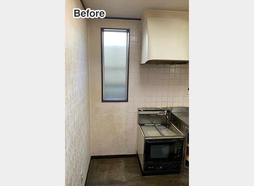 シンク前の縦長の窓は窓枠を塗り替えています。以前のお住まいでは、この窓の右下にガスコンロが設置されていました。