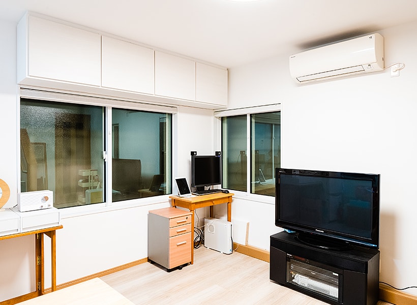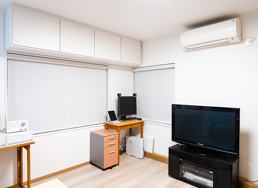 ロールスクリーンですっきりした印象です。窓上部の収納は特注加工で天井までぴったりに収めました。「割高にはなりましたが、天井まで無駄なく収まるサイズにしたことで、中の収納を十分確保することができました」と奥さま。
