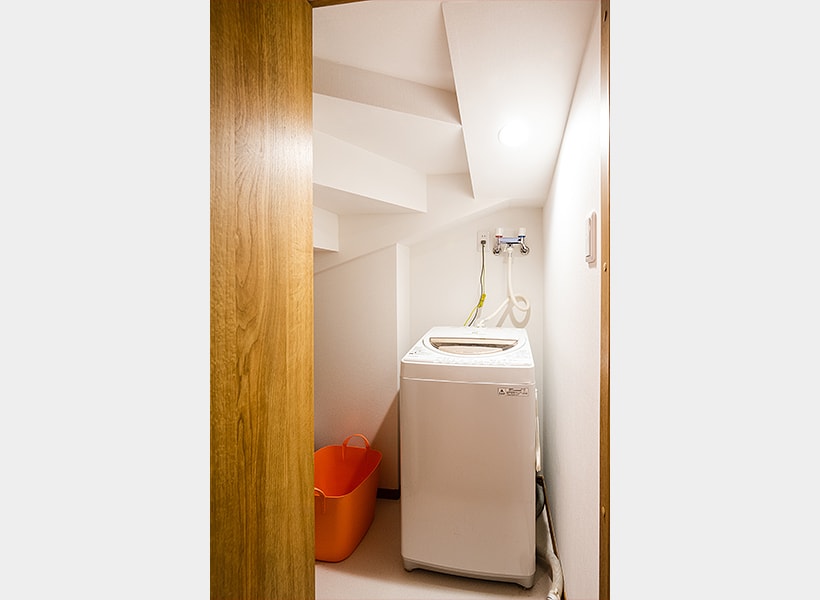 洗濯機置き場は奥が階段下の空間になっているため、十分な収納力があります。