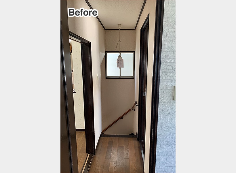 ダークブラウンだった玄関扉をライトブラウンにしたことで、玄関ホールが明るい印象になりました。