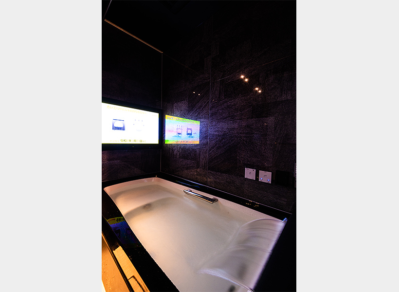 石目調鏡面パネルが印象的な、黒でまとめた浴室。アクアタワー(洗い場側水栓)もオプションカラーの黒をお選びになるなど、娘さんは「徹底的に黒にこだわりました」とおっしゃいます。ライン照明やタワーライトの調光・調色機能で、その日の気分に合わせたバスタイムを楽しんでいらっしゃるそうです。