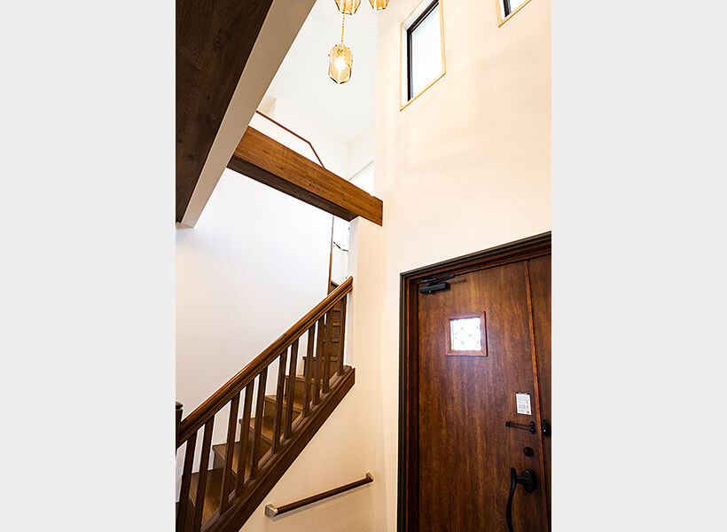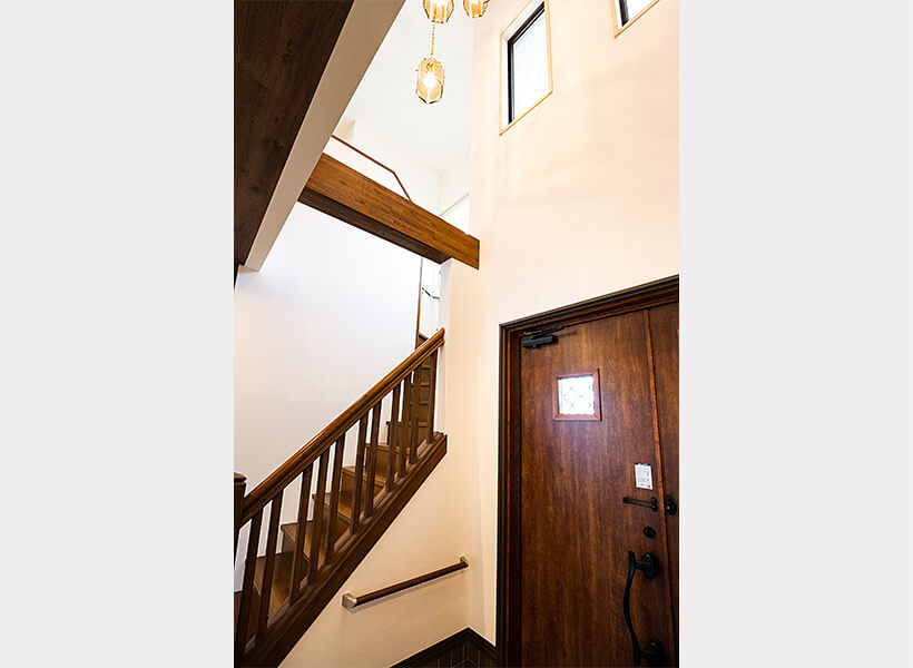 玄関ドアと玄関灯は、洋風の玄関ホールに合わせてコーディネートしました。額縁カバーのボリュームによって、思いのほか重厚感のある玄関になりました。工期の短い、リフォーム用の玄関ドアを採用しています。