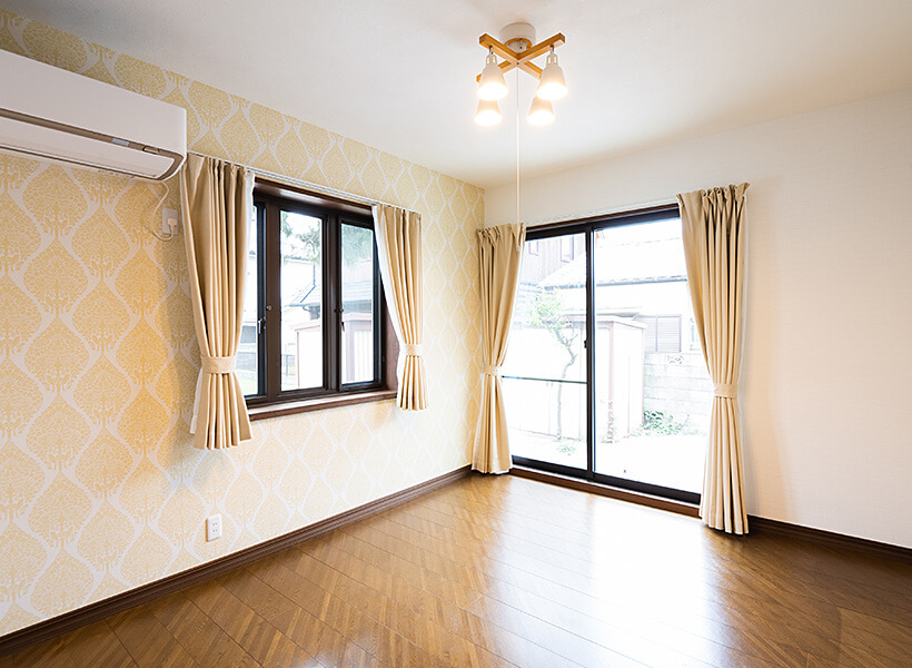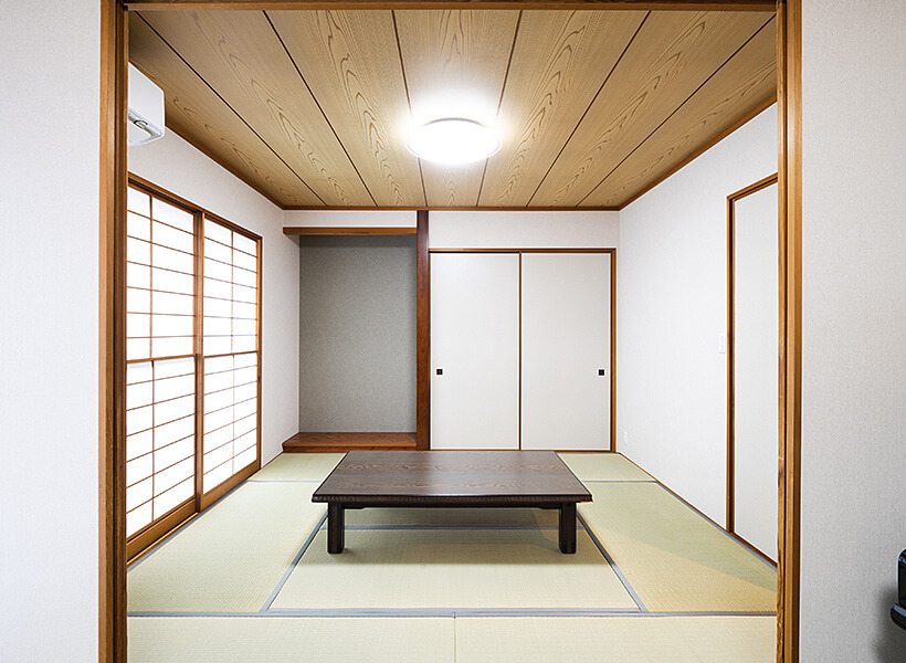 二間続きの和室は、畳を新しくし、障子・襖を貼り替えて明るくなりました。以前は掛け軸が掛かっていたという床の間の壁をアクセントクロスにしたことで、和室全体が品よく引き締まりました。