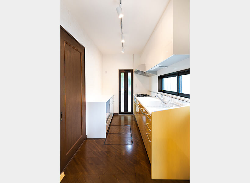 サフランイエローのキッチン扉に合わせ、背面のクロスには目地が黄色のレンガ調クロスを選びました。ドア枠のない開口部は、ダイニング側のクロスをキッチン側へ巻き込んだことで、煉瓦のモールのような印象になりました。