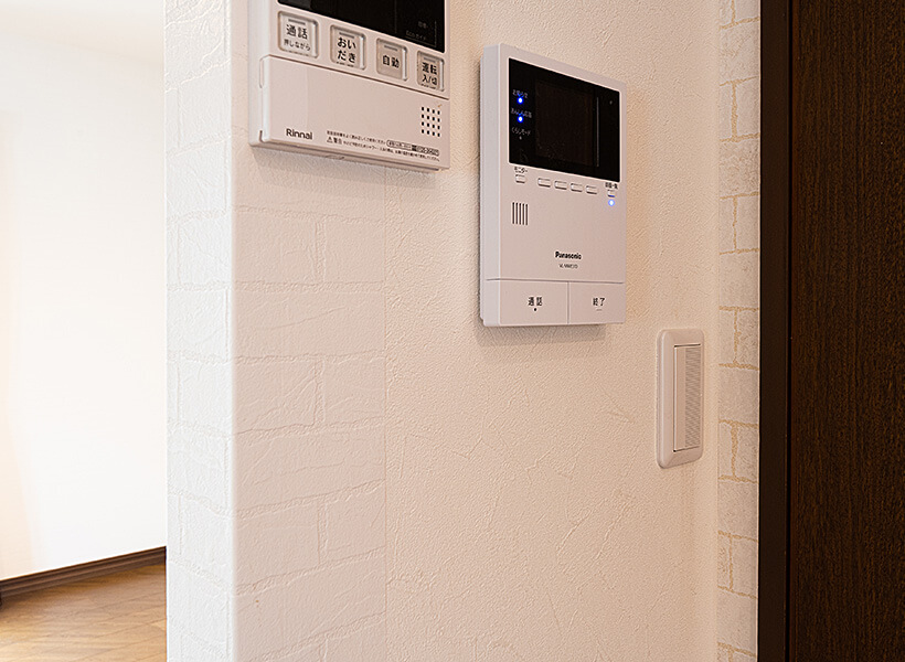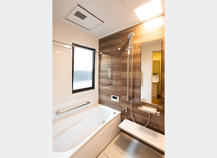 木目の壁パネルは、ロッジ風の浴室でのんびりとバスタイムを愉しみたいとおっしゃるM様のご希望です。高齢のお父さまのために浴室暖房機を、掃除が楽になるように床洗浄機能を付けました。