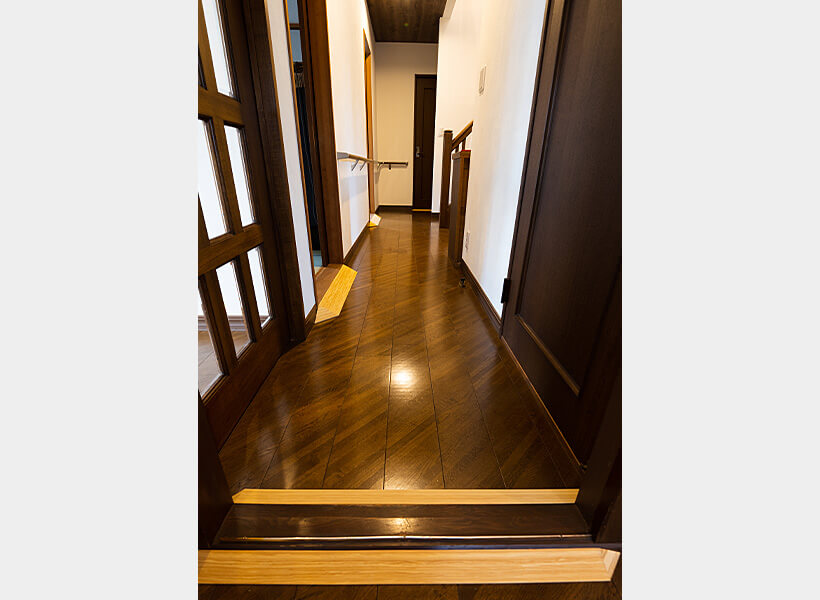 足元の安全のために、敷居の段差には段差解消スロープを取り付けました。手すりも設置して、たまに訪れる場所だからこそ、誰もが安全に過ごせるように配慮しました。清掃とワックスがけで、フローリングはピカピカになりました。