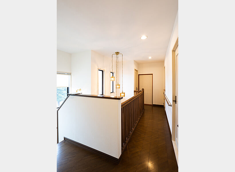 2階の廊下へも手すりを取り付けています。天井のダウンライトはLEDライトに交換し、灯数を増やしました。お母さまがお選びになったシャンデリアや装飾が施された手すり、アイボリーの扉なども、清掃によって新築当時の明るさがよみがえりました。