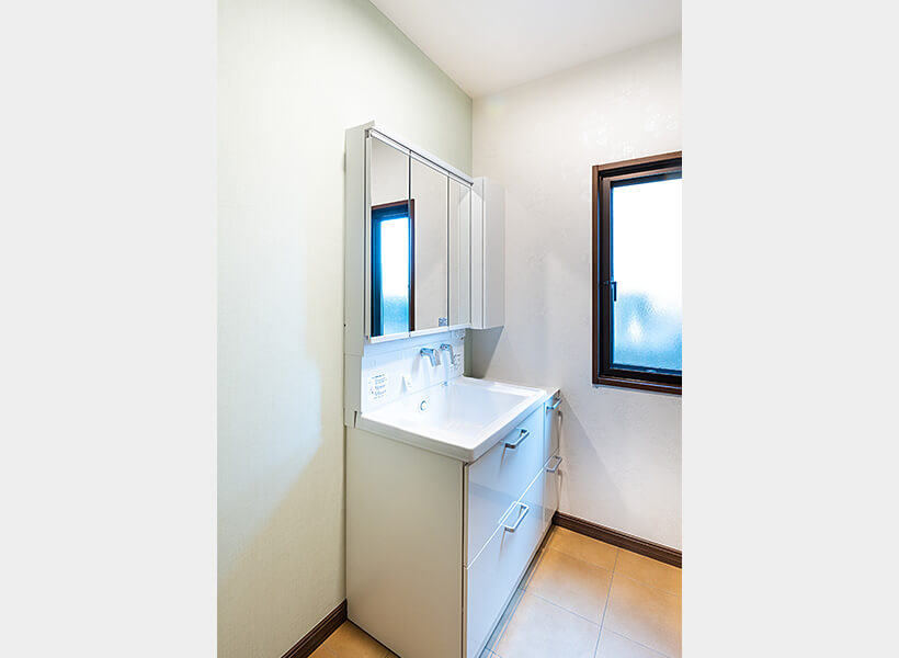 「長くきれいに使うことができるよう、陶器製のボウルにこだわり、除菌水での清掃ができるものを選びました」と娘さん。グリーンと白のクロスを生かすよう、洗面化粧台は白でまとめています。
