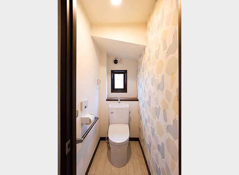 「クロスは遊びの要素も入れて自由に選びました」と、おっしゃる娘さんがこだわったアクセントクロス。「洗面室はさわやかなグリーンを基調にして、白い花柄のクロスをアクセントにしました。トイレのムーミンのクロスは、姪が喜ぶと思います」と娘さん。